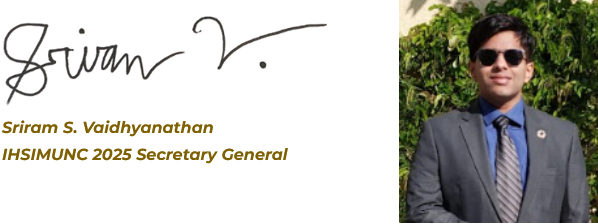 Hello! I'm Sriram Vaidhyanathan and I'm your Secretary General for this year's Irvine High School Invitational MUN Conference! I have been in MUN for four years and it has helped me develop a passion for public speaking, politics, and the world of global affairs (pun not intended), having gained experience from General Assembly to Crisis as well as Senate committees. I hope to help you all learn and grow in this year's conference and I can't wait to meet you all!